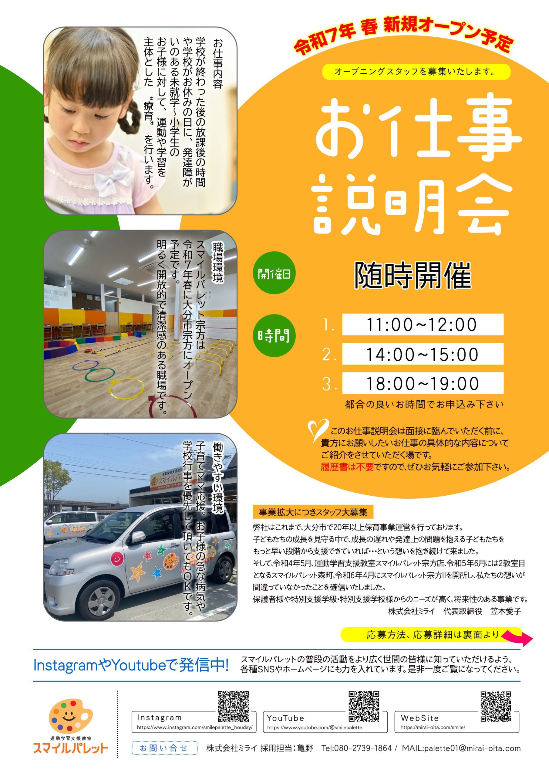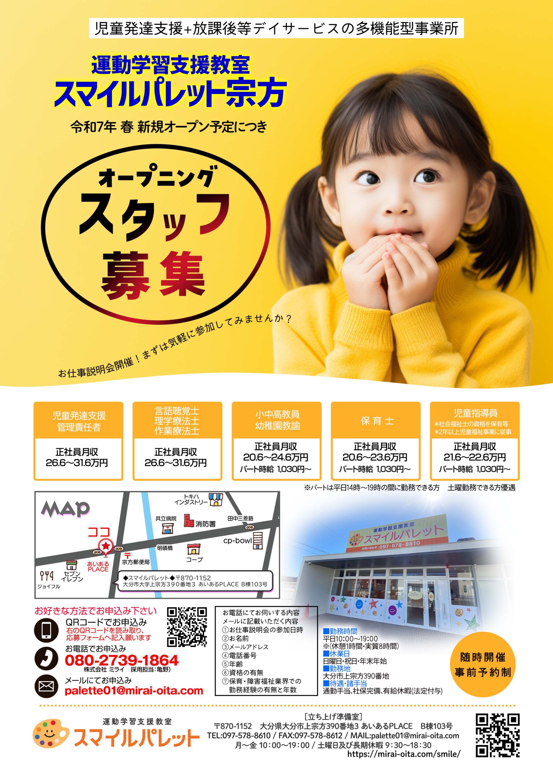 スタッフ募集 スマイルパレット宗方 2025.01.20 Post Share Hatena LINE RSS feedly Pin it note この記事のタイトルとURLをコピーする 運動学習支援教室 スマイルパレット宗方では、お仕事説明会を随時開催!お気軽にお問合せください。 Post Share Hatena LINE RSS feedly Pin it note