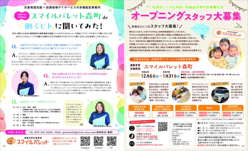 スマイルパレット森町 オープニングスタッフ募集 2024.12.09 Post Share Hatena LINE RSS feedly Pin it note この記事のタイトルとURLをコピーする スマイルパレット森町では、事業拡大につきスタッフ大募集! お仕事説明会は12月6日~1月31日 (毎週月曜から土曜開催)時間①11:00~12:00 ②14:00~15:00 ③18:00~19:00(事前予約制) 場所は、スマイルパレット森町にて!お気軽にお電話ください。℡097ー547ー9202 Post Share Hatena LINE RSS feedly Pin it note
