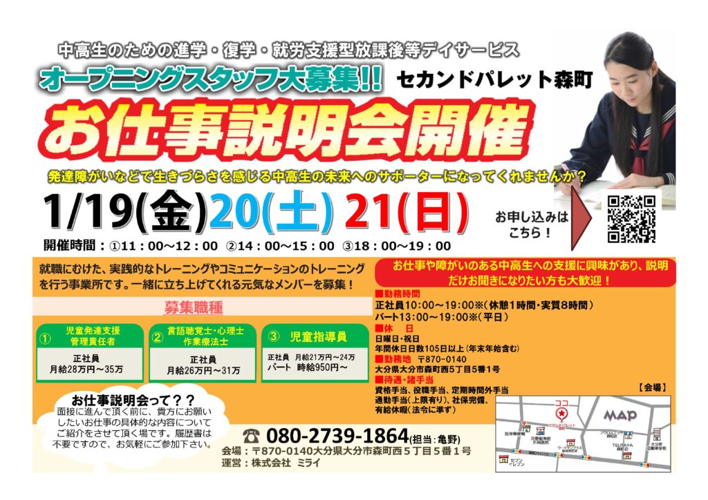 セカンドパレットお仕事説明会開催! 2023.12.26 Post Share Hatena LINE RSS feedly Pin it note この記事のタイトルとURLをコピーする オープニングスタッフ募集! セカンドパレット森町お仕事説明会開催! 中高生のための進学・復学・就労支援型放課後等デーサービスのお仕事です。 発達障がいなどでいきづらさを感じる中高生の未来へのサポーターになってみませんか? 開催日:1/19(金)20(土)21(日) お仕事説明会は面接に臨んでいただく前に、お仕事の具体的な内容についてご紹介させていただく場です。 履歴書は不要ですので、ぜひお気軽にご参加下さい。 Post Share Hatena LINE RSS feedly Pin it note